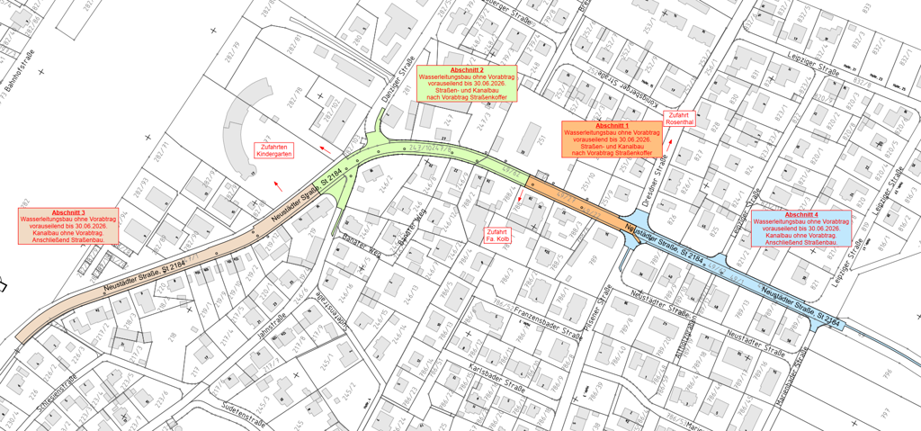 Die Maßnahme erstreckt sich über mehrere Bauabschnitte, beginnend mit dem ersten Bauabschnitt zwischen der Dresdner Straße und dem Küchenstudio Kolb. Die Zufahrt zur Kita St. Franziskus ist durchgehend über eine der beiden Zufahrten möglich. Aktuelle Informationen zur Baumaßname sowie einen Plan über die verschiedenen Bauabschnitte finden Sie auf der gemeindlichen Homepage im Bereich Planen und Bauen.