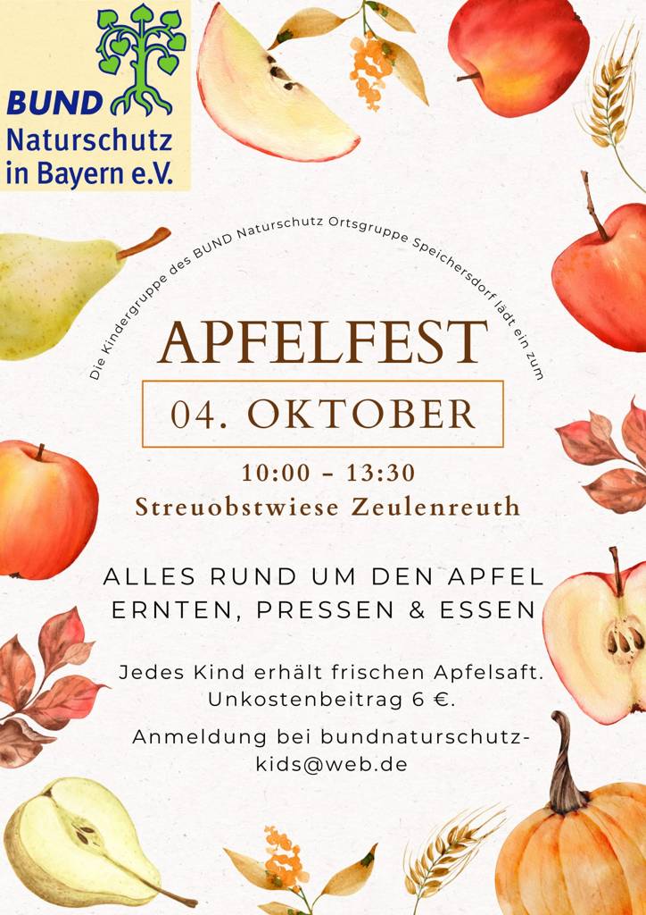 Die Kindergruppe des BUND Naturschutz Ortsgruppe Speichersdorf lädt herzlich zum Apfelfest am Samstag, den 04.10.2025, auf der Streuobstwiese Zeulenreuth ein.