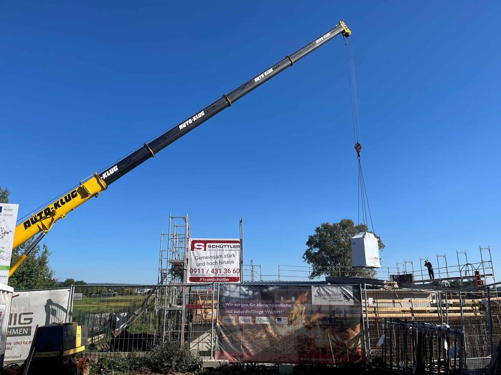 Am gestrigen Montag wurden die zwei Hackschnitzel-Heizkessel mit je 600 kW Leistung für das Nahwärmenetz im Speichersdorfer Zentrum angeliefert. Ein Autokran brachte die beiden Wärmeerzeuger schließlich an ihren Platz in der Heizzentrale an der Grüngutannahmestelle. Bekanntlich errichtet die gemeindeeigene Bioenergie Speichersdorf (Geschäftsführung: KEWOG, Tirschenreuth) aktuell ein Nahwärmenetz im Zentrum Speichersdorfs. Eine 2700 Meter lange Nahwärme-Leitung versorgt künftig im ersten Bauabschnitt über 300 Wohneinheiten, das Luise-Elsässer-Seniorenheim, das evangelische Gemeindehaus sowie vier kommunale Liegenschaften mit regenerativer Wärme. Jährlich sollen damit 3100 MWh Wärme erzeugt und 1265 Tonnen CO₂ vermieden werden. Am morgigen Mittwoch wird an gleicher Stelle der Pufferspeicher angeliefert. Auch hier wird in es im Bereich rund um das Feuerwehrhaus zu Verkehrsbehinderungen kommen. Der Grüngut-Container wurde daher vorrübergehend auf dem Parkplatz am Fitness-Studio versetzt.