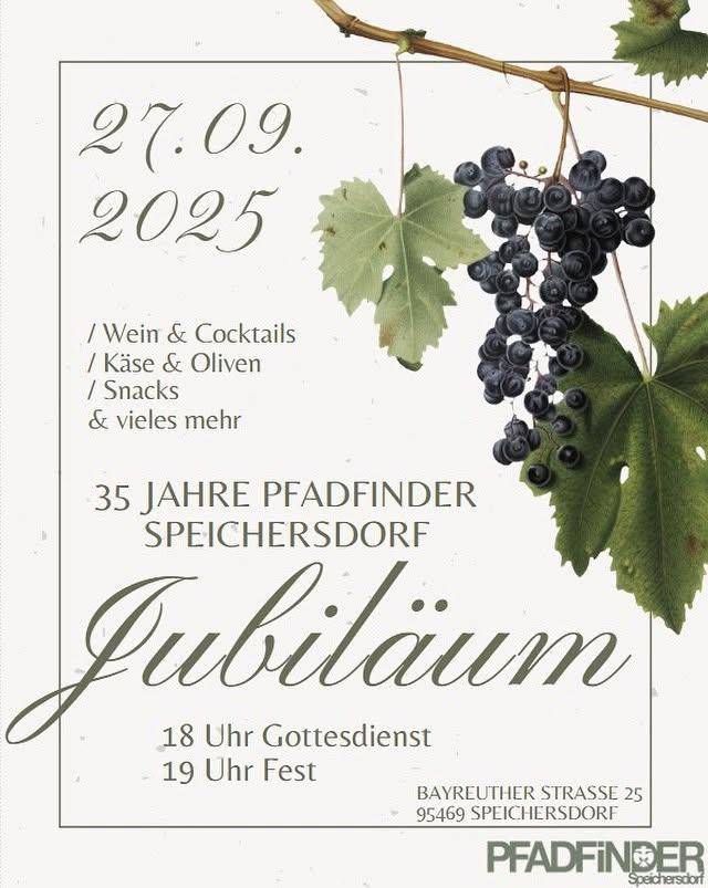Die Pfadfinder Speichersdorf laden am Samstag (27.09.2025) herzlich zum 35-jährigen Jubiläum ein. Los geht es um 18:00 Uhr mit einem Gottesdienst. Um 19:00 Uhr folgt die Feier mit Wein & Cocktails, Käse & Oliven, leckeren Snacks und vieles mehr.