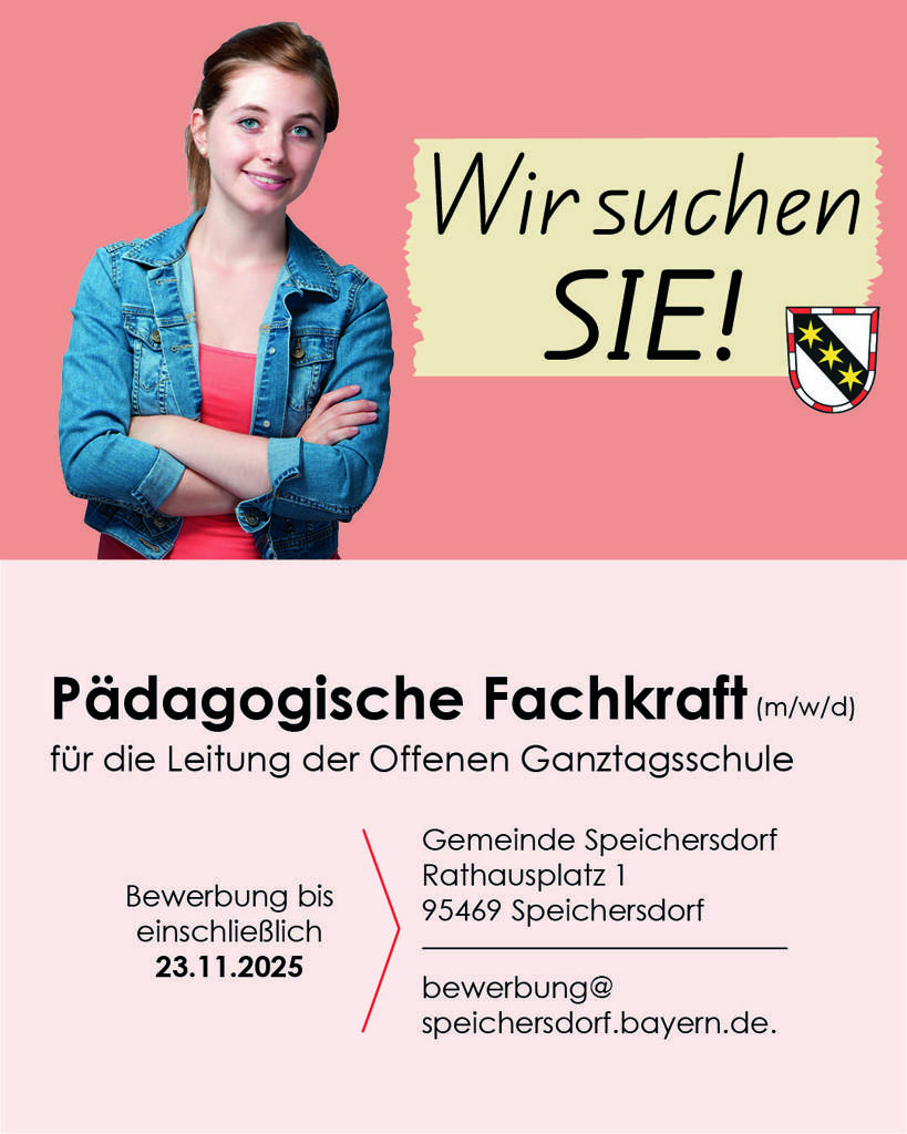 Die Gemeinde Speichersdorf sucht aktuell eine pädagogische Fachkraft für die Leitung (m/w/d) der Offenen Ganztagsschule (OGTS). Die OGTS, welche an der Werner-Porsch-Grundschule Speichersdorf eingerichtet wird, startet mit dem Betrieb offiziell zum kommenden Schuljahr 2026/2027. Die Einstellung ist jedoch zu einem früheren Zeitpunkt geplant, da für einen reibungslosen Beginn schon vorher viele Vorbereitungen zu treffen sind. Die Stellenausschreibung kann im Internetangebot der Gemeinde unter Rathaus & Politik/Karriere abgerufen werden. Für etwaige Rückfragen steht Ihnen unser Verwaltungsleiter, Herr Thorsten Leusenrink (09275/988-22), gerne zur Verfügung.