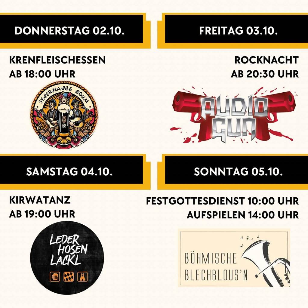 Los geht es am Donnerstag (02.10.) mit dem Krenfleischessen ab 18:00 Uhr. Für die musikalische Umrahmung sorgen die Feierhaisl Buam.