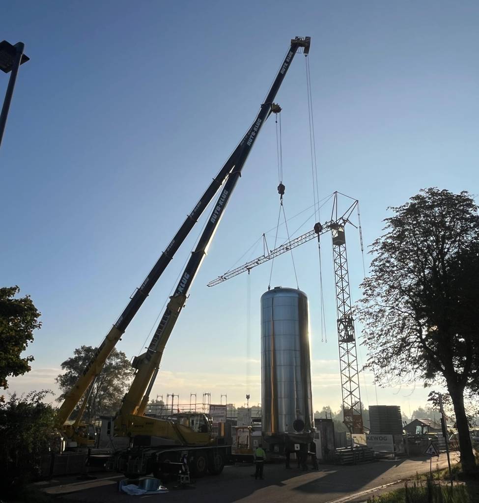 Mit einem Schwertransport und zwei mobilen Autokränen wurde der Pufferspeicher für das Nahwärmenetz Speichersdorf-Zentrum am heutigen Mittwoch in unserer Gemeinde angeliefert und aufgestellt. Der Speicher hat ein Fassungsvolumen von 60.000 Litern und sorgt dafür, dass die beiden Heizkessel effizienter genutzt werden können. Die Montage erfolgt durch die Firma Günthner aus Wirbenz. Das Heizhaus wird von der Speichersdorfer Firma König errichtet. Bauherr ist die Bioenergie Speichersdorf GmbH & Co KG, die zu 100% der Gemeinde gehört. Die Geschäftsbesorgung erfolgt durch die KEWOG Energie & Dienste aus Tirschenreuth.
