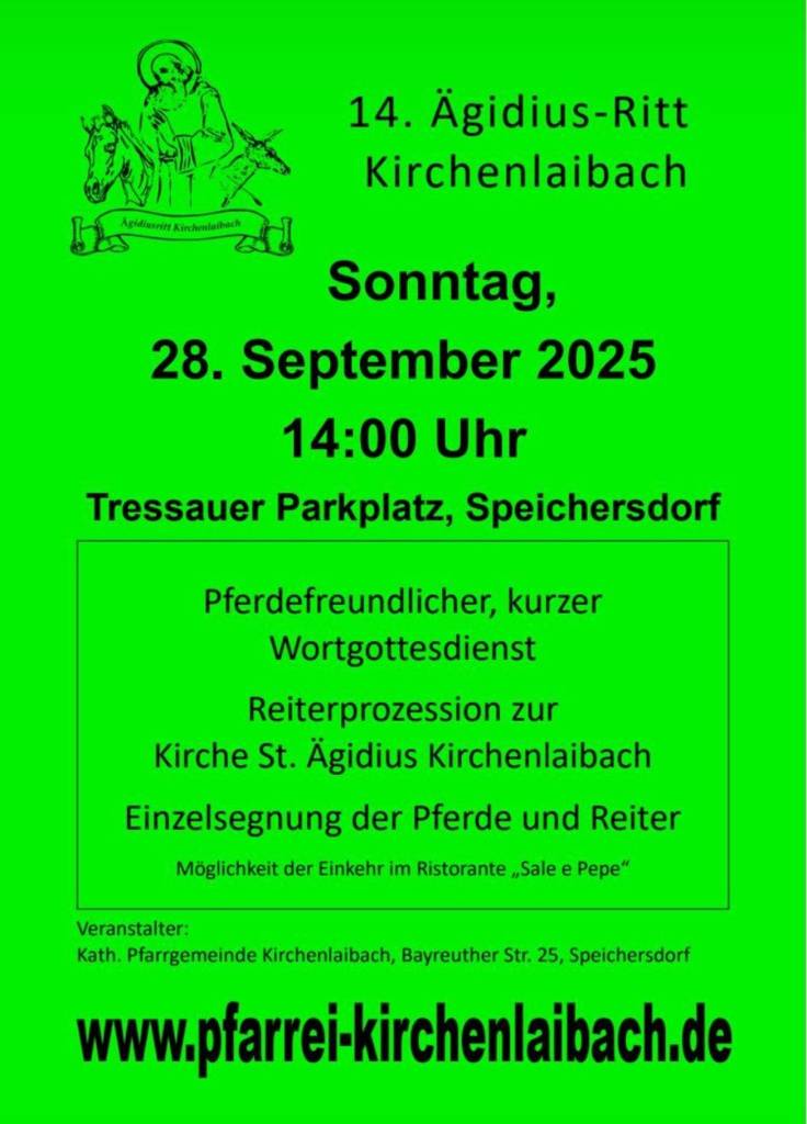 Am kommenden Sonntag (28.09.2025) findet der 14. Ägidius-Ritt um 14:00 Uhr in Speichersdorf statt. Treffpunkt ist der Tressauer Parkplatz.